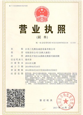 江蘇三毛教儀成套設備有限公司是一家集設計、生產、銷售、售后為一體的大型制造企業(yè)。坐落于風景秀麗的花木之鄉(xiāng)、全國經濟百強縣、國家級經濟開發(fā)區(qū)沭陽縣永嘉路。
